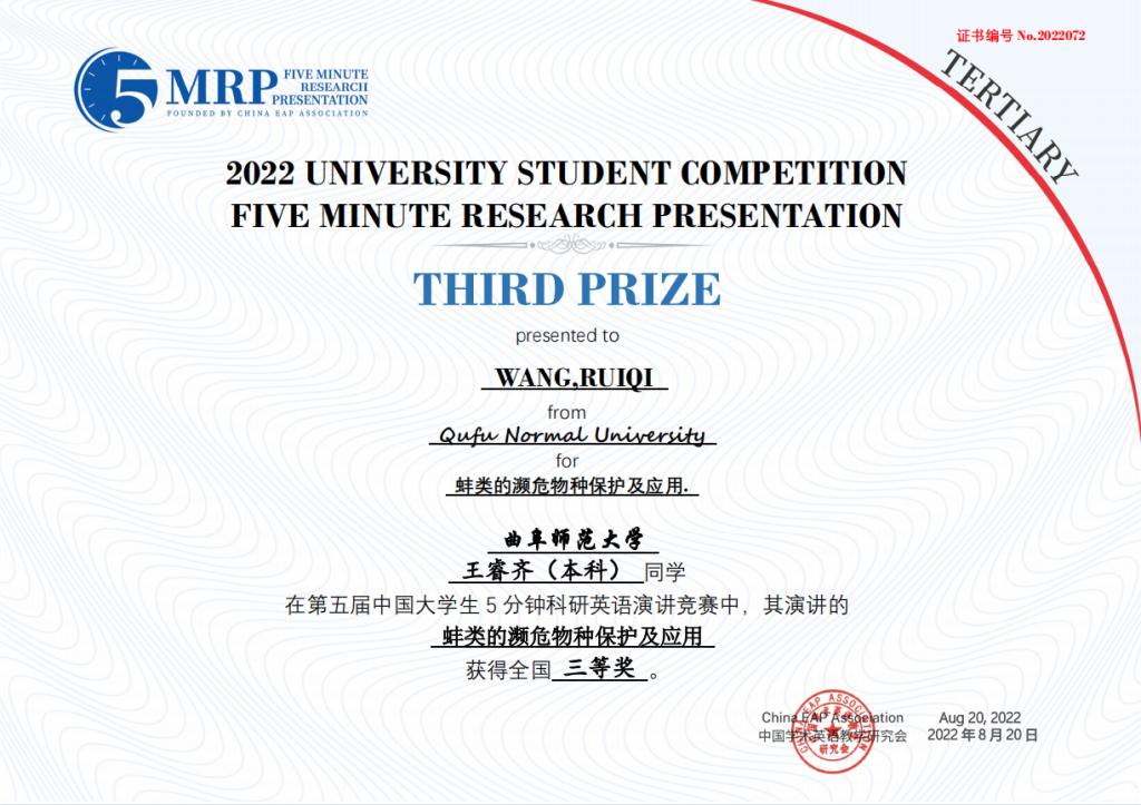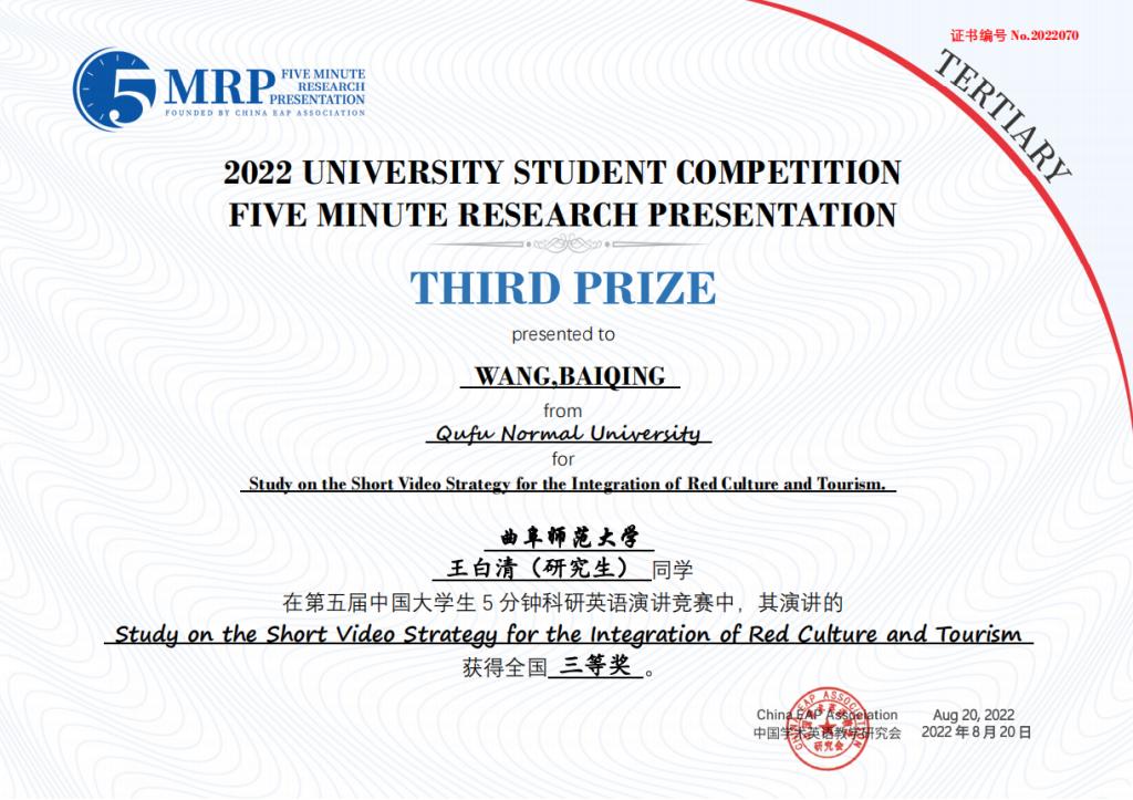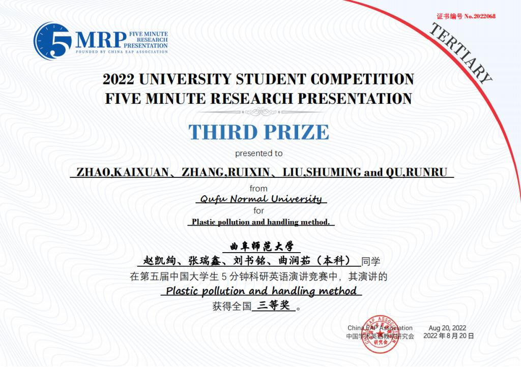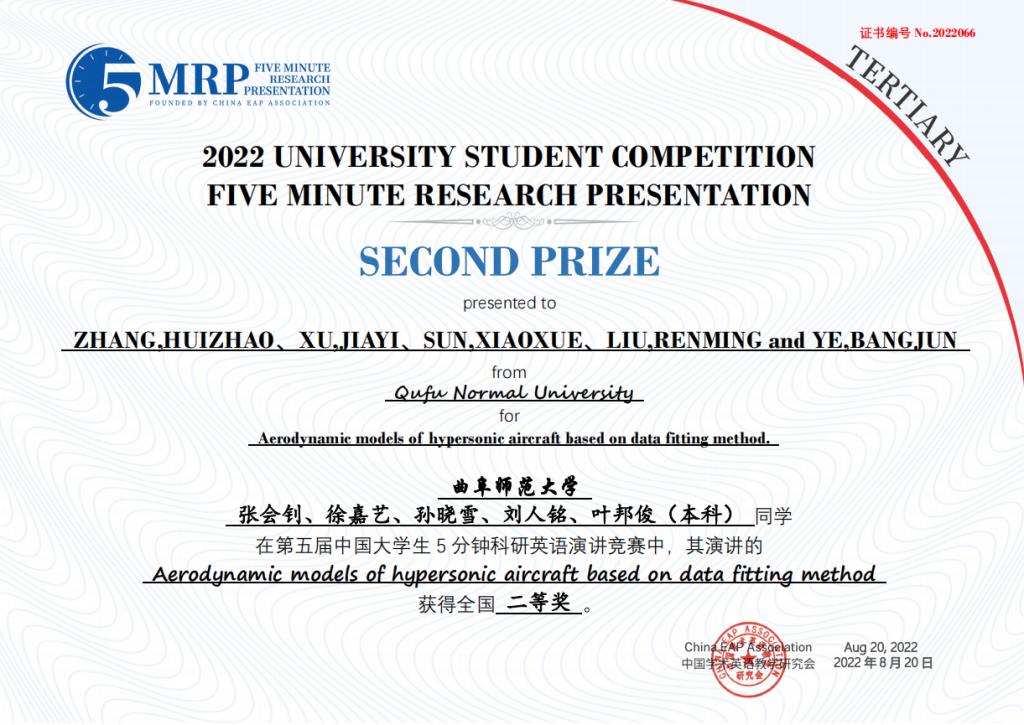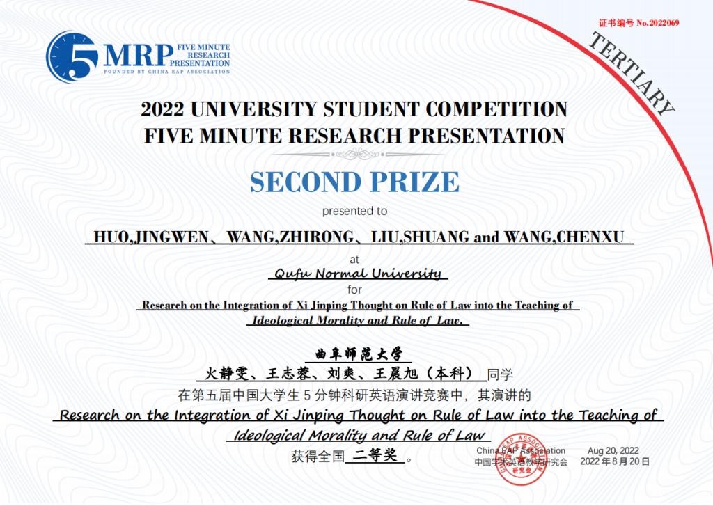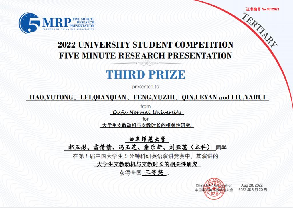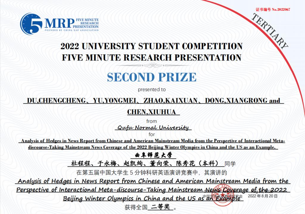 附2:第五届中国大学生五分钟科研英语演讲大赛三亿官方网站获奖团队获奖证书