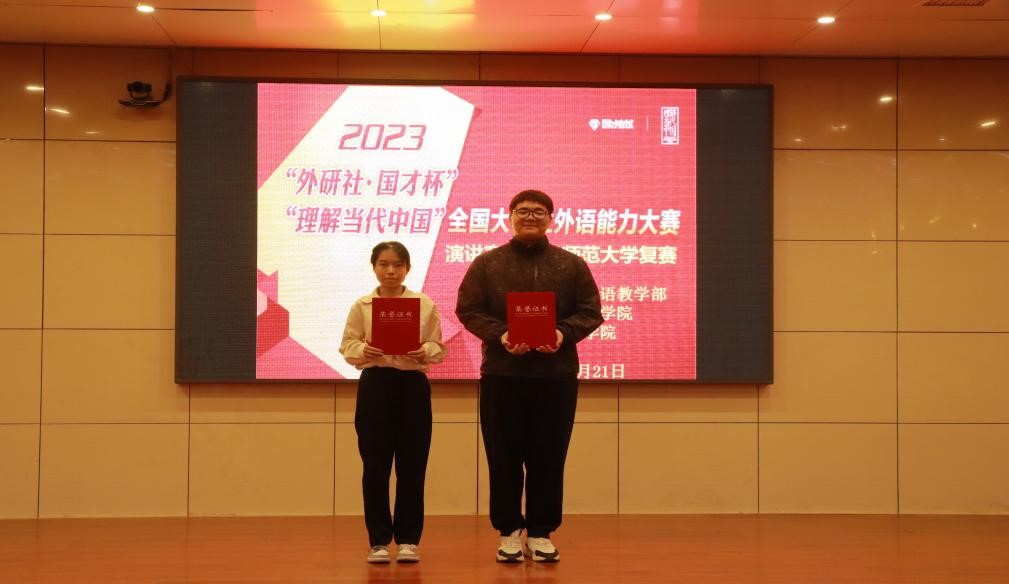 比赛环节分为两轮。第一轮为定题演讲和回答问题。参赛选手聚焦中国式现代化道路,从不同维度阐释了中国式现代化的价值蕴含、时代特质与世界意义。第二轮为即兴演讲和回答问题。赛题涵盖习近平新时代中国特色社会主义思想核心内容,涉及文化建设、社会建设和生态文明建设等领域的重要话题。赛题形式多样,包含文字、图片、格言等类型,综合考查了选手的应变能力、思辨能力、语言表达能力、知识广度及思想深度。面对构思精妙、寓意深刻、充满挑战的赛题,参赛选手挥斥方遒,直抒胸臆,为广大师生奉上了一场精彩绝伦的视听盛宴,彰显了当代青年自立自信的时代形象和奋斗底色。经过激烈角逐,沈冰和彭佳骏凭借其缜密逻辑和扎实素养,从12名入围复赛选手中脱颖而出,晋级省赛。