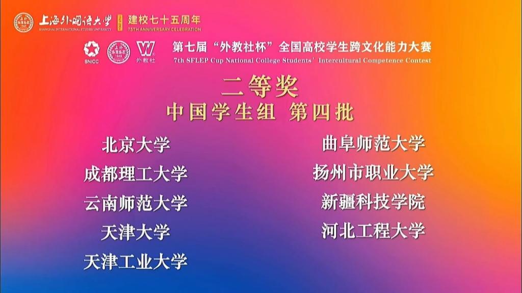 “外教社杯”全国高校学生跨文化能力大赛坚持立德树人根本任务,以服务国家战略、促进人才培养为导向,旨在为全国高校师生提供一个展示跨文化交流能力、交流跨文化教学经验的平台,2023年已被纳入“全国普通高校大学生竞赛榜单”,是外语类学科竞赛的权威赛事之一。大赛致力于培养“知中国、爱中国、懂中国”的时代新人,引领青年人坚定文化自信、开阔国际视野,培养具有跨文化能力的高素质国际化人才,助力国际传播能力建设,促进中外文明交流。