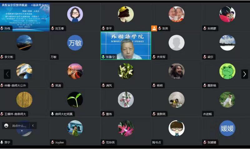 7月19日上午,三亿(中国)邀请我校优秀校友、南京林业大学外国语学院副院长、张鲁宁教授作“大学英语一流课程建设”线上专家报告会。报告会由副主任孙伟主持,主任王福祥、各教研室主任、各课程建设团队负责人及其全体骨干成员参加。